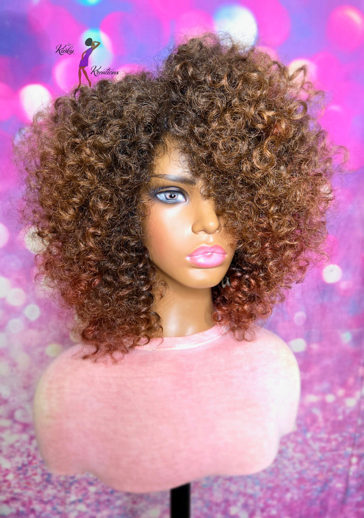 I bring to you this beautiful wig that gives you natural looking curls in autumn colors of copper and browns. Soft handmade curls make up this wig, the hair is slightly textures and has a natural look and feel. The curls are soft , bouncy and full and resemble a roller set done on blown out natural hair. This wig is made with a right side part and a natural hairline along the front perimeter. The hairline can be teased for a more natural look.