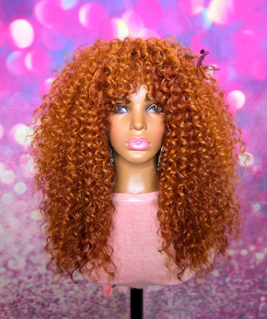 Beautiful soft textured curls make up this unit. This wig is made in a beautiful ginger and copper color and styled with a fringe bang that is soft and has wispy ends. The wig is voluminous and can be fluffed out if more volume is desired.