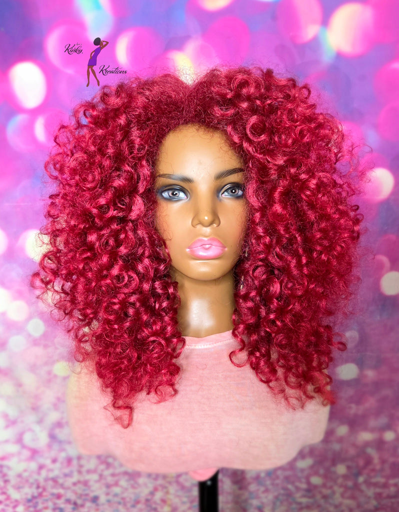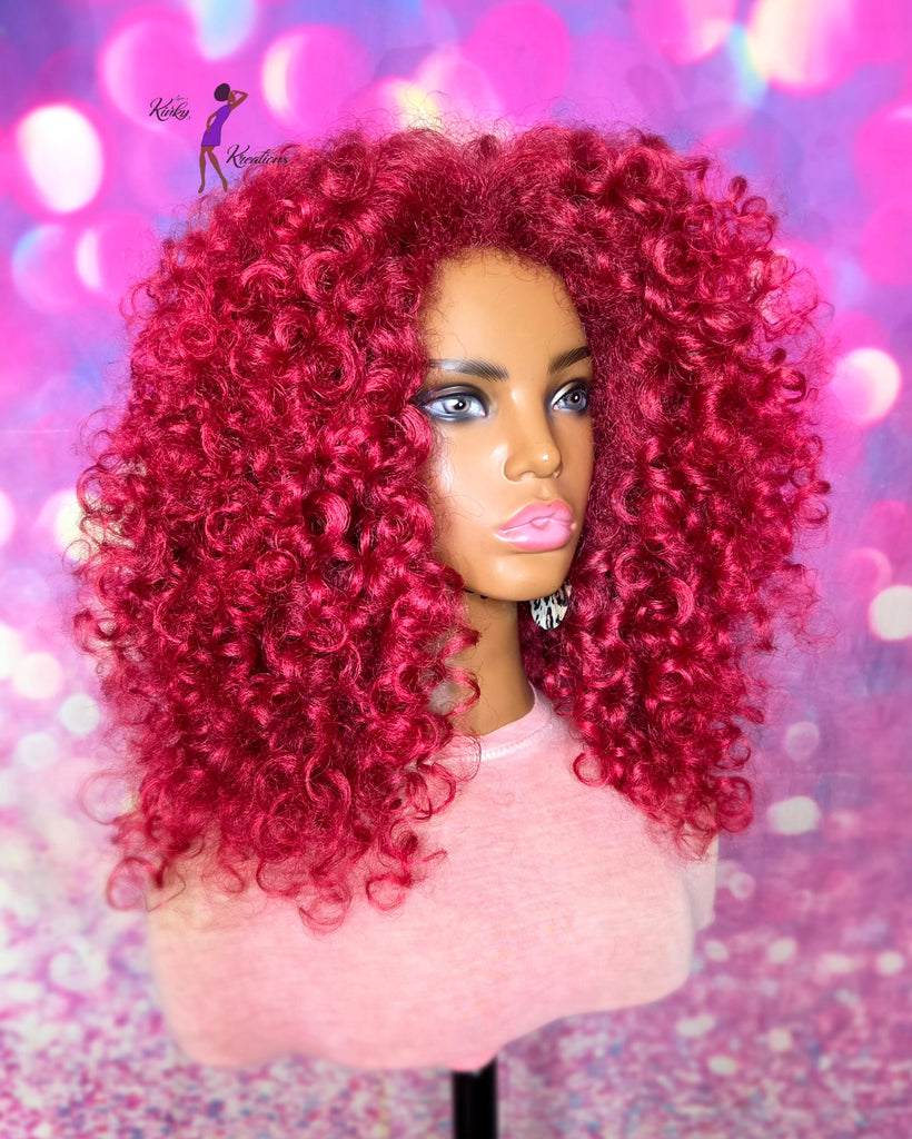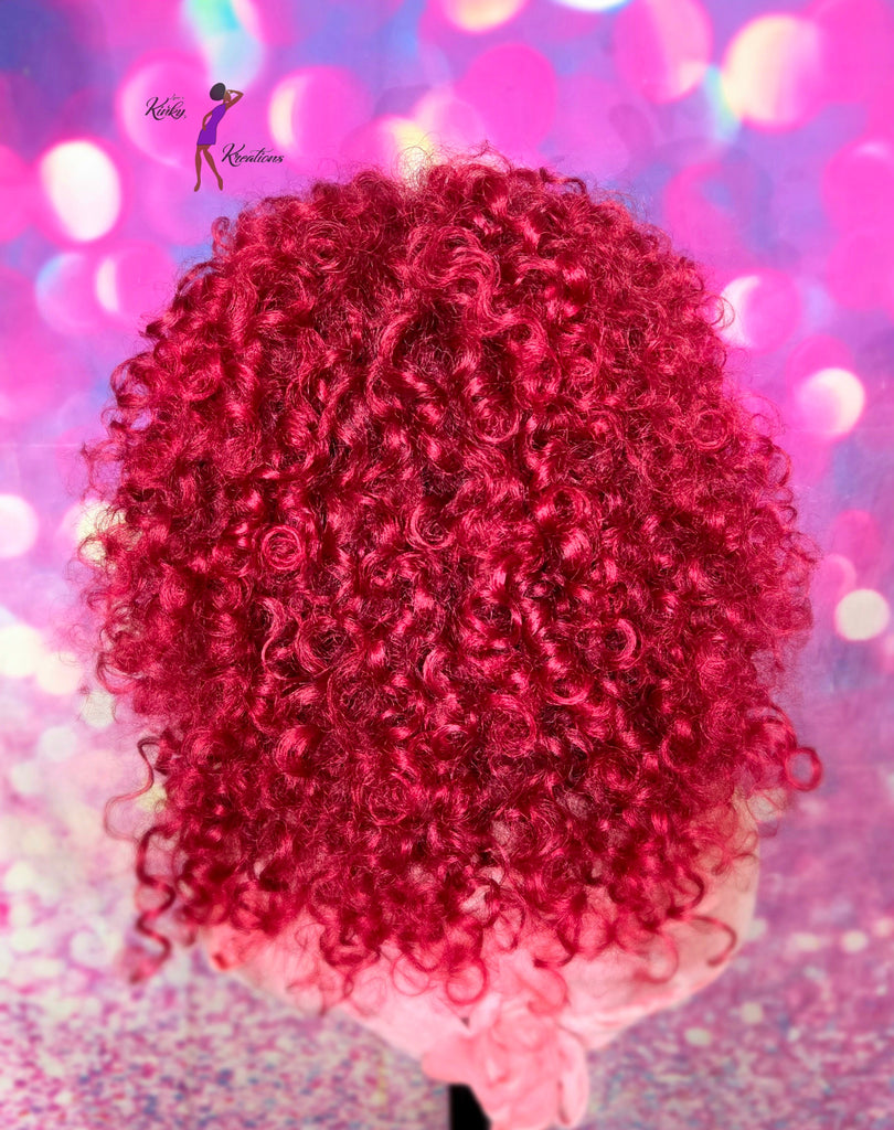 Soft handmade curls make up this wig, the hair is slightly textures and has a natural look and feel. The curls are soft , bouncy and full and resemble a roller set done on blown out natural hair. This wig is made with a natural hairline along the front perimeter allowing for versatile styling options. The hairline can be teased for a more natural look.